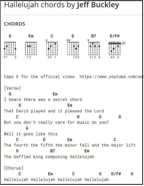 Open a 6th window and search the internet (not Youtube) by typing the name of the song plus the word ‘chords’ & ‘artist’s name.’ Example: hallelujah chords buckley